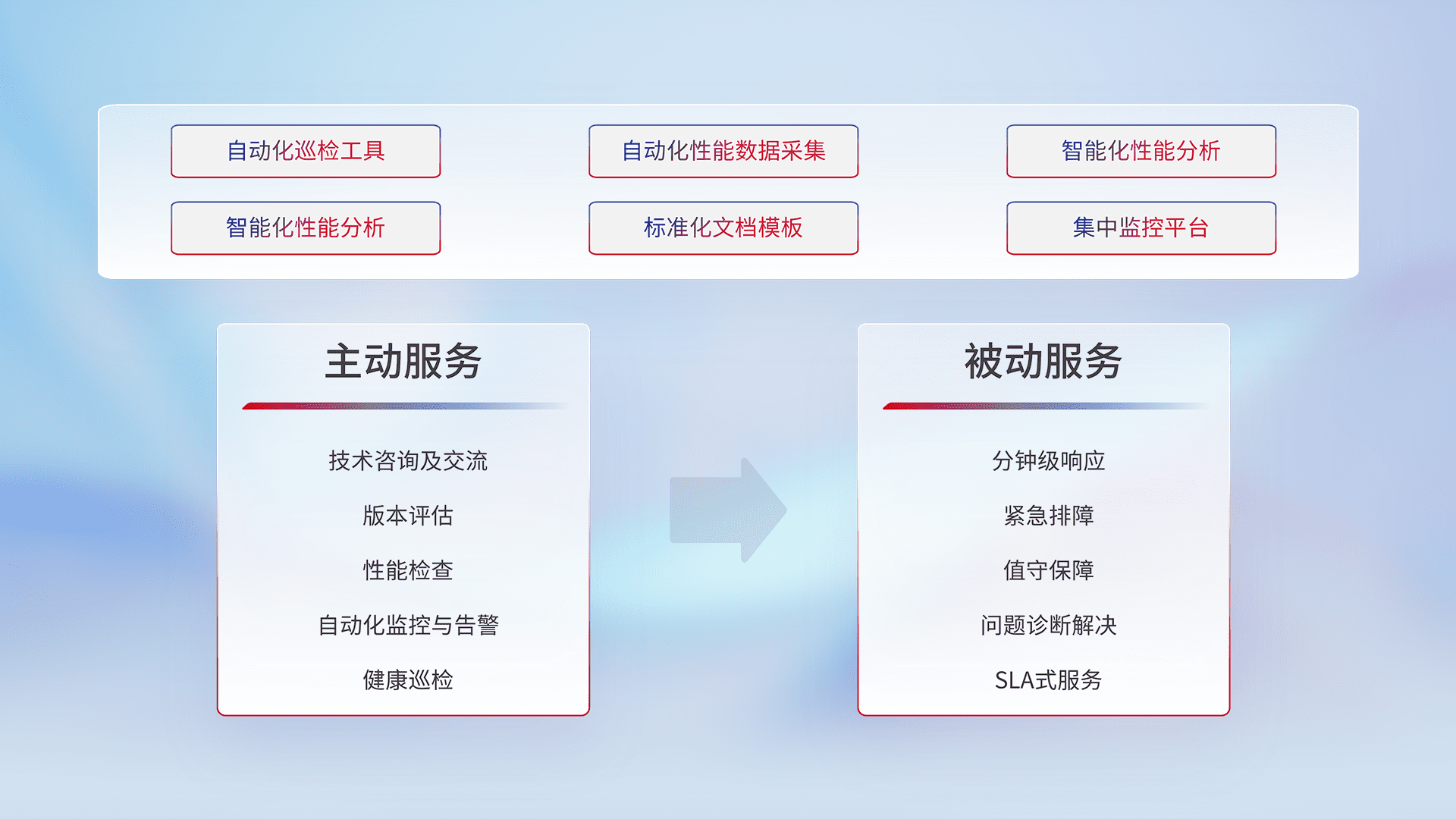 智能化工具和标准化文档,,保障服务质量,,,,提供主动服务(包含技术咨询、、、、版本评估、、、性能检查、、、、自动化监控与告警、、、健康巡检)和被动服务包含(分钟级响应、、、、紧急排障、、、、值守保障、、问题诊断解决、、、、SLA服务)。。。