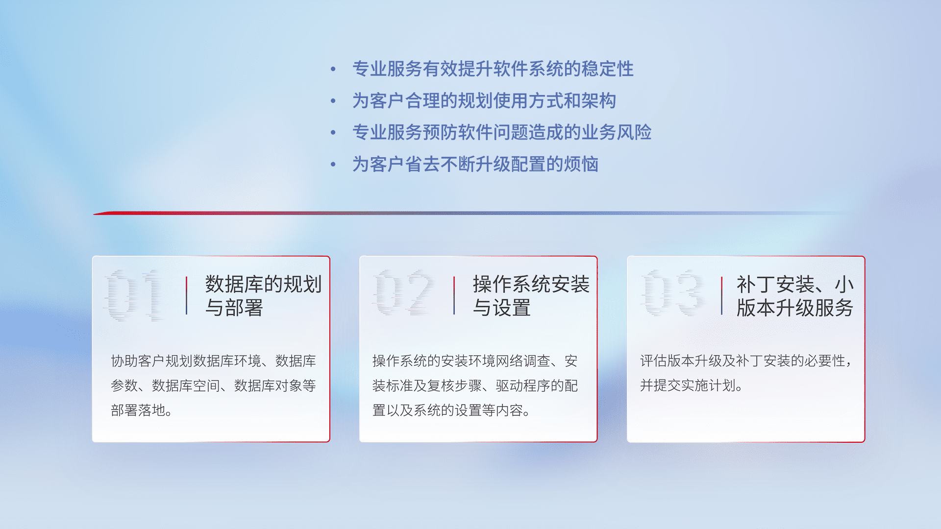 为客户提供软件规模升级、、快速部署、、、按需配置的专业服务,,从数据库的规划与部署到操作系统的安装与设置,,,再到补丁安装和小版本升级提供支持。。